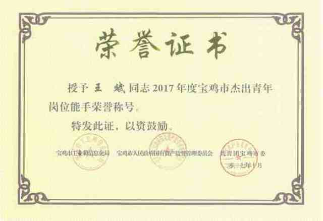 王斌作為青年員工的杰出代表,他先后獲得西電集團先進生產者、寶光股份先進生產者,零件事業部勞動競賽三等獎等多項榮譽,所帶領的班組多次被評為公司以及事業部先進班組。